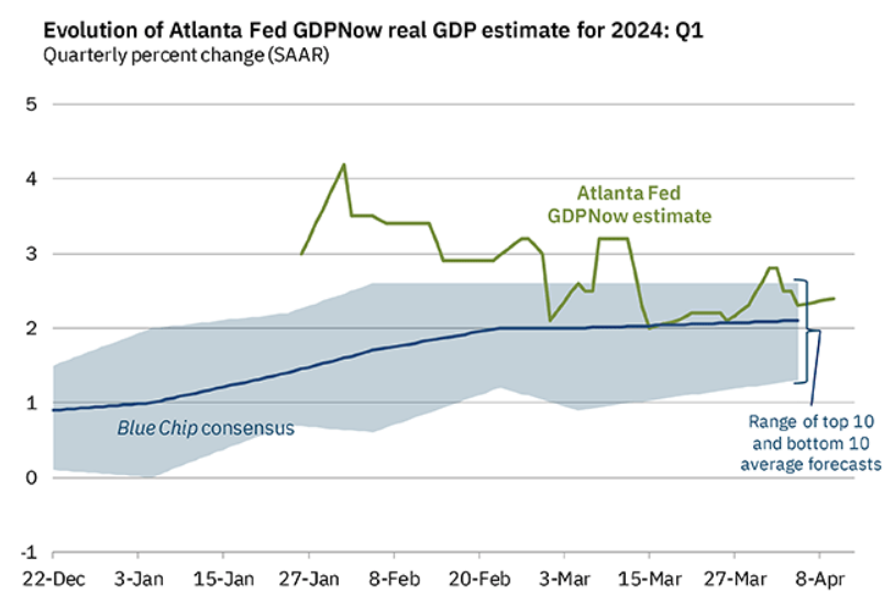 GDP+6%は・・・、一応GDPNowは2.4%を予想している。チャートを張っておきます。2024/4/10付けの最新版;